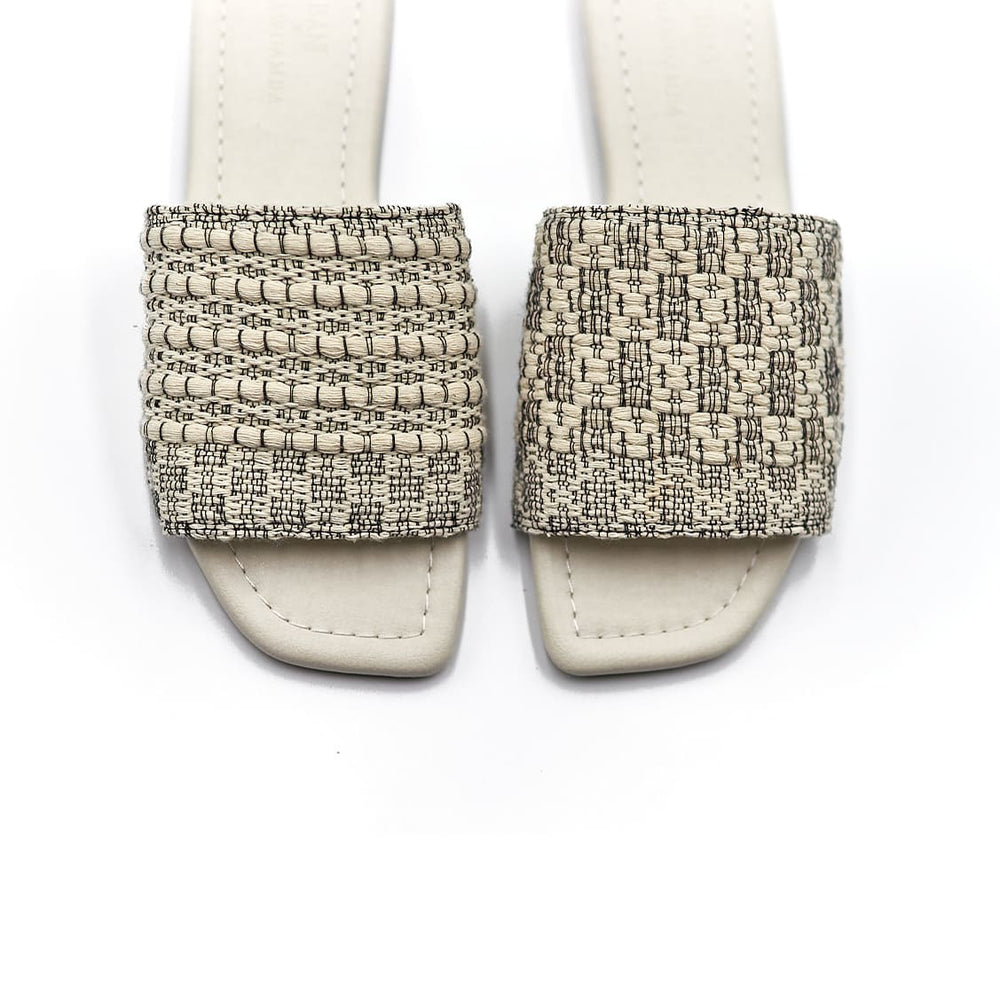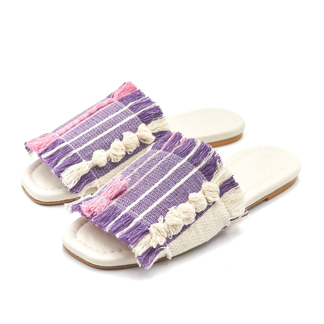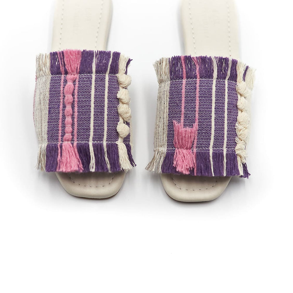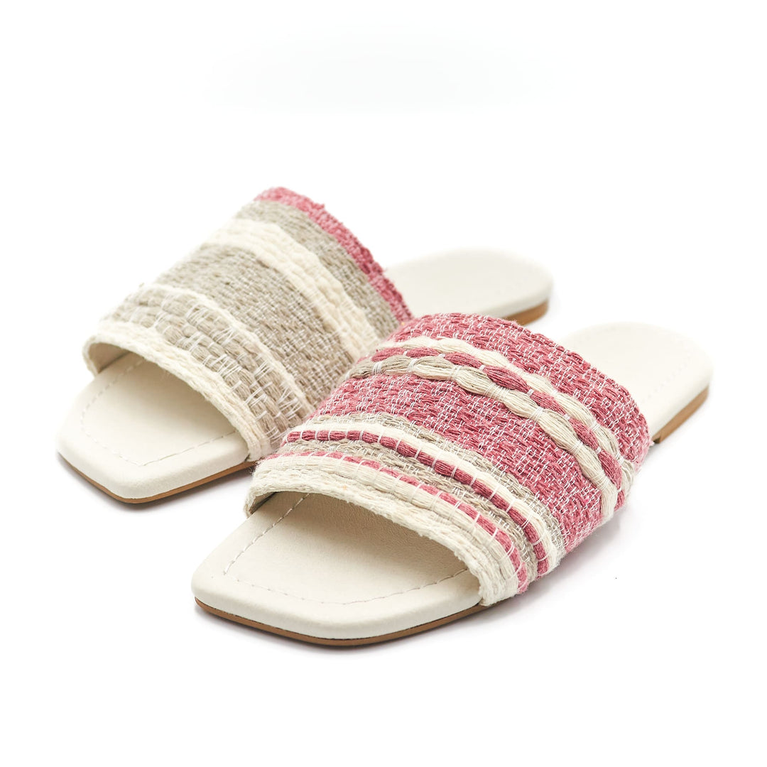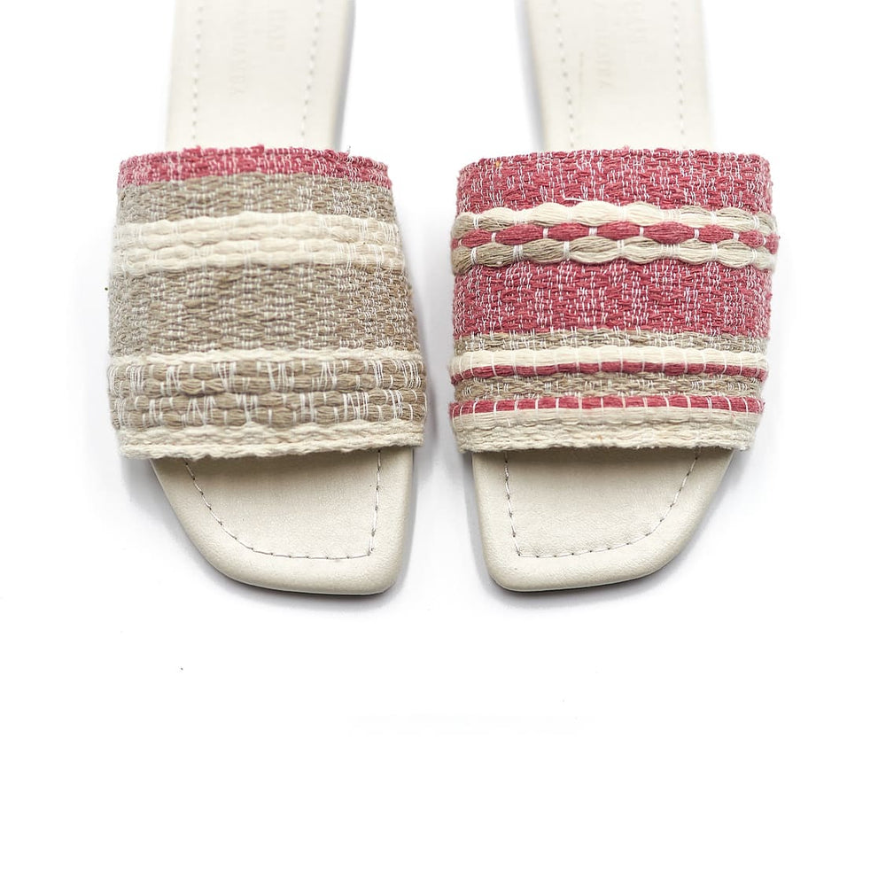 Sandalia plana creada a base de materiales regenerados con planta confort y textil de telar de pedal multicolor. Acabado en punta semi cuadrada.
