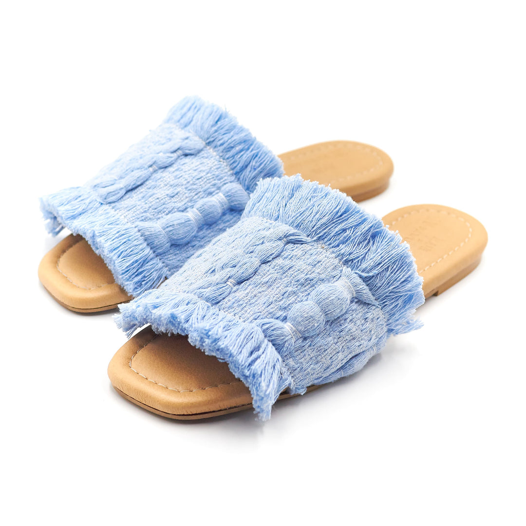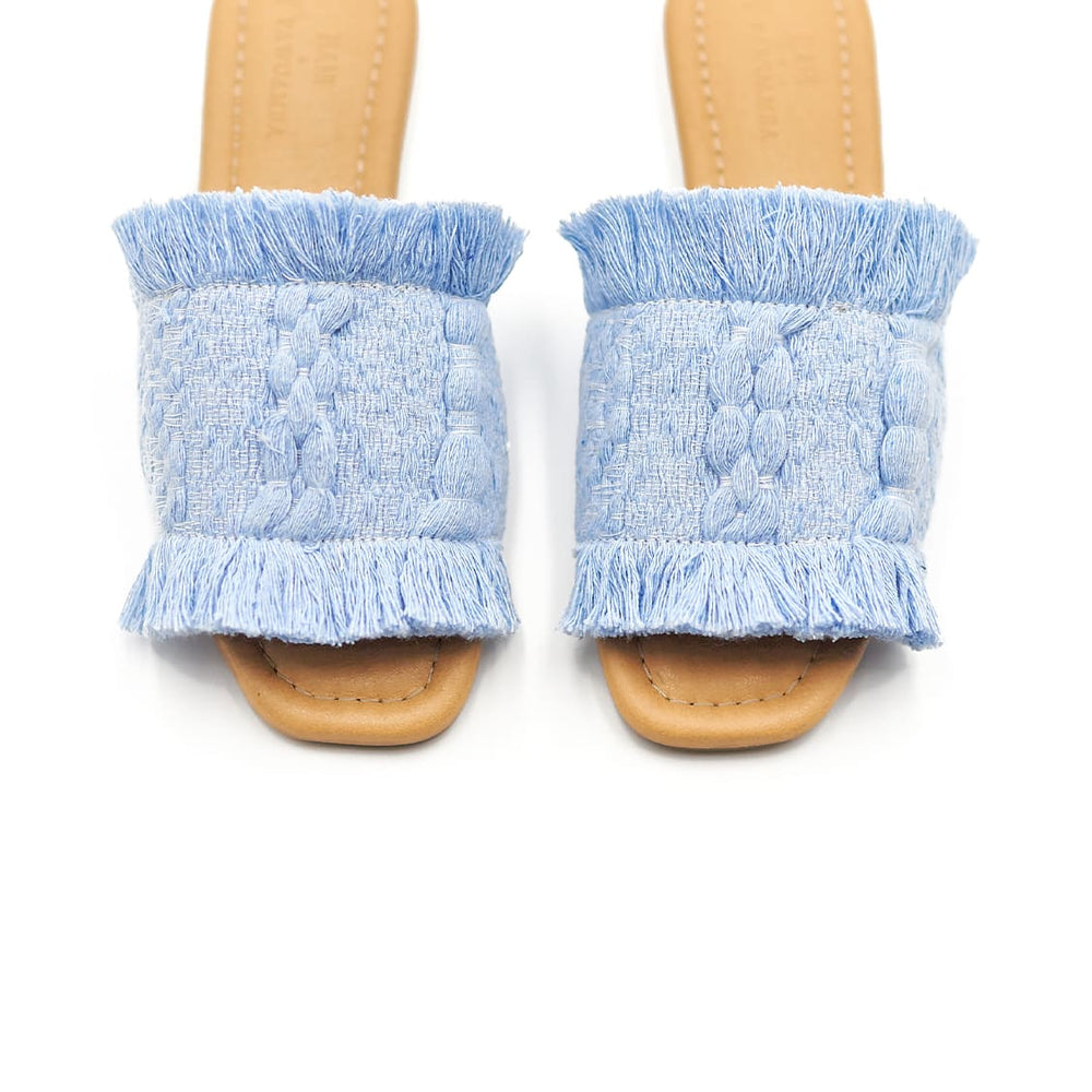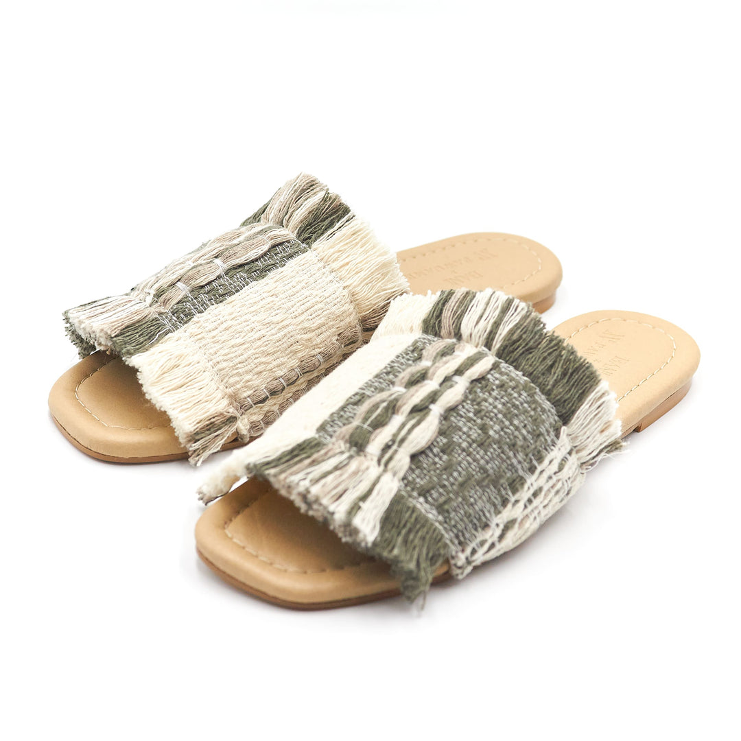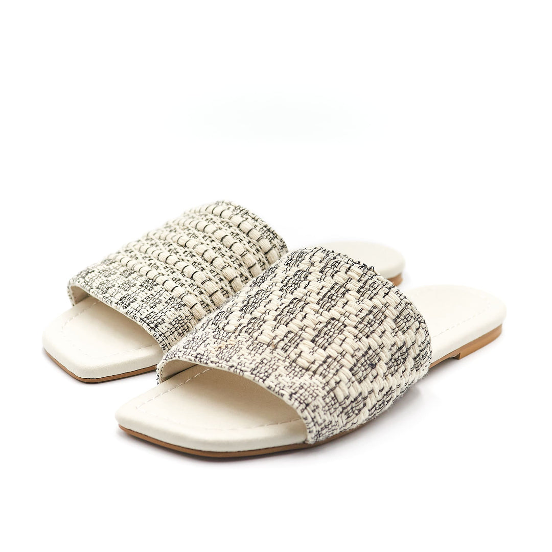 Sandalia plana creada a base de materiales regenerados con planta confort y textil de telar de pedal multicolor. Acabado en punta semi cuadrada.
